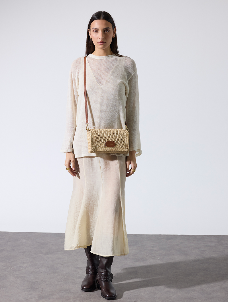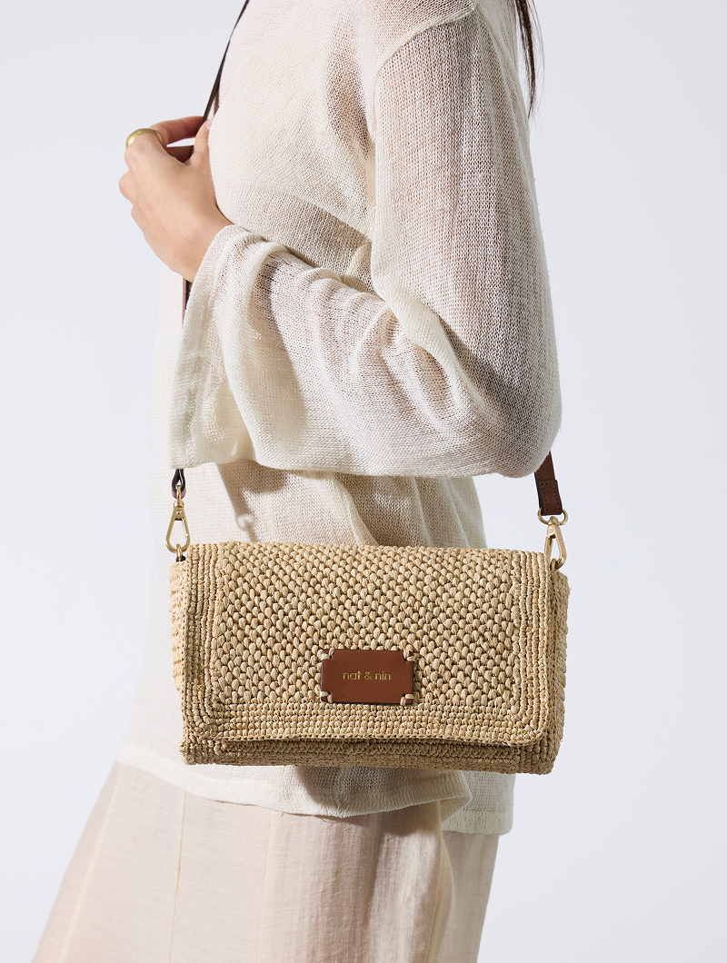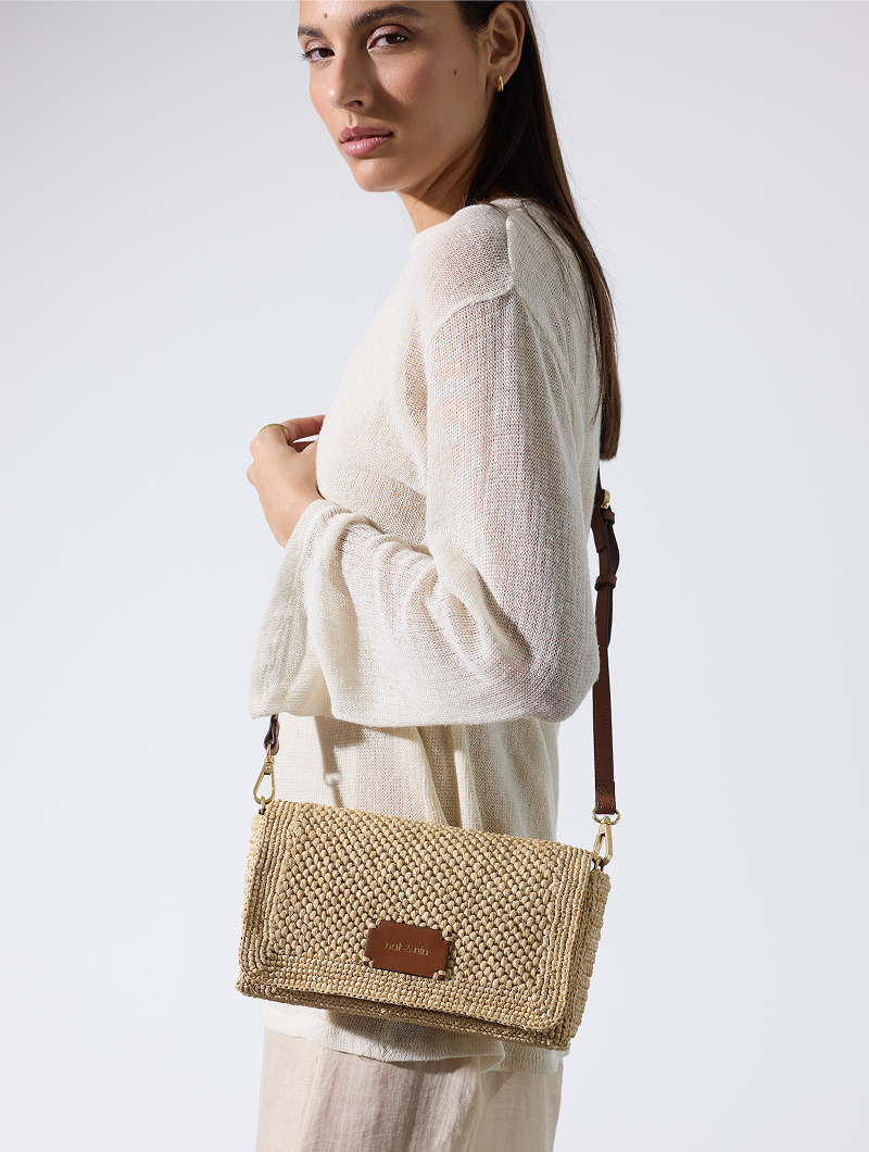 The Palermo crossbody bag combines elegance and practicality. Its removable and adjustable shoulder strap allows for comfortable carrying, while its two snap closures and interior slip pocket ensure easy organization. Leather details and natural raffia add texture and style to this compact bag.