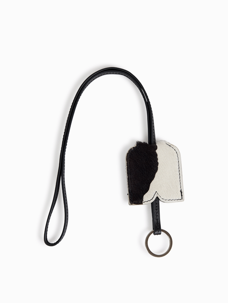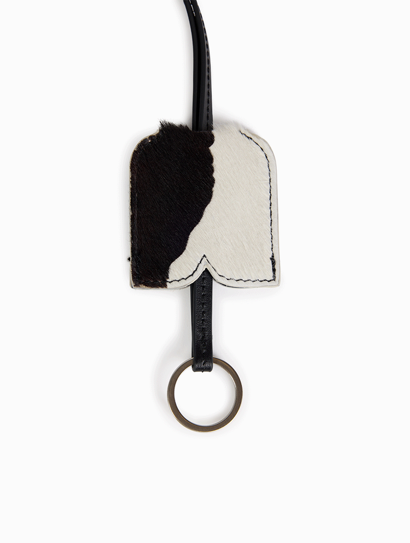 Unique and fashionable, this keychain features a cow print, the bold signature of the capsule collection designed with Nona Source. Compact and lightweight, it easily clips onto your bag, adding a touch of wild-chic style to your keys.