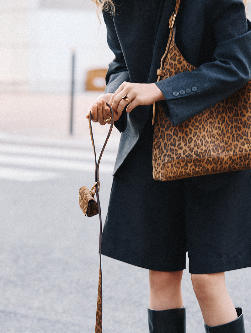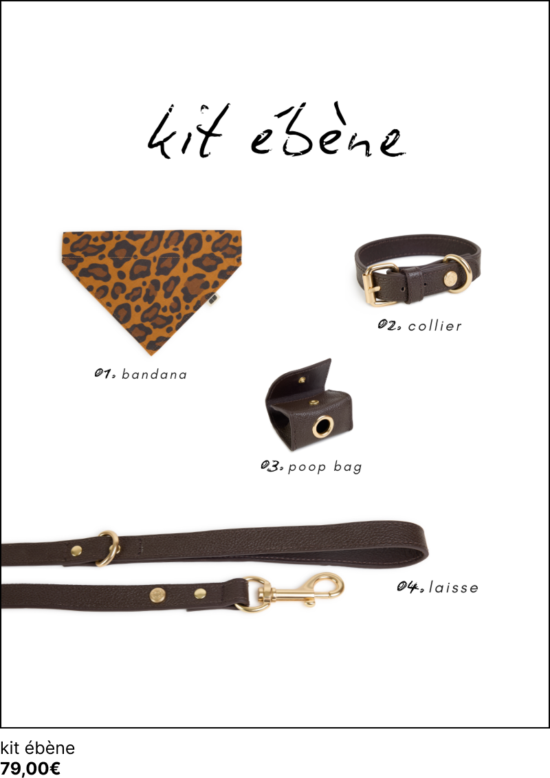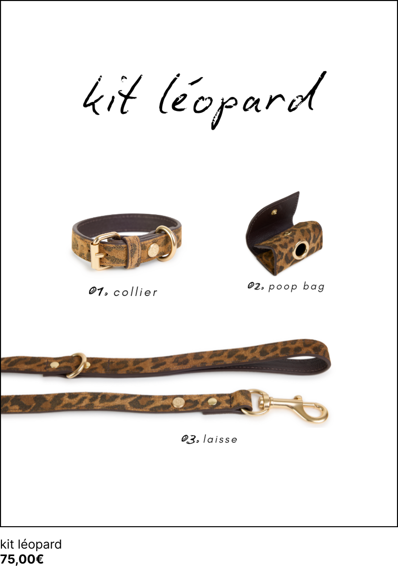 El kit de ébano de cuero liso viene acompañado de un pañuelo de algodón con estampado de leopardo, para un sutil toque de moda. El kit de ante de leopardo, por su parte, destaca por su aspecto asertivo y lleno de carácter.