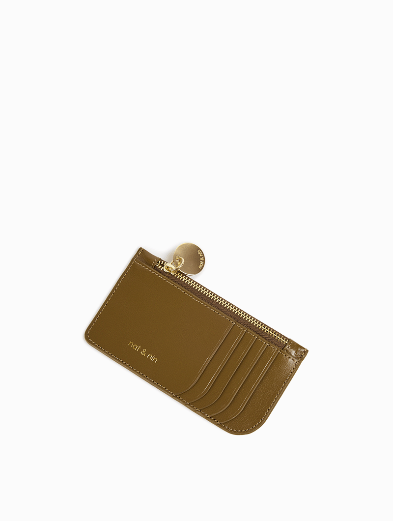 Alix, un porte-cartes à la fois porte-monnaie revisité avec un médaillon doré.