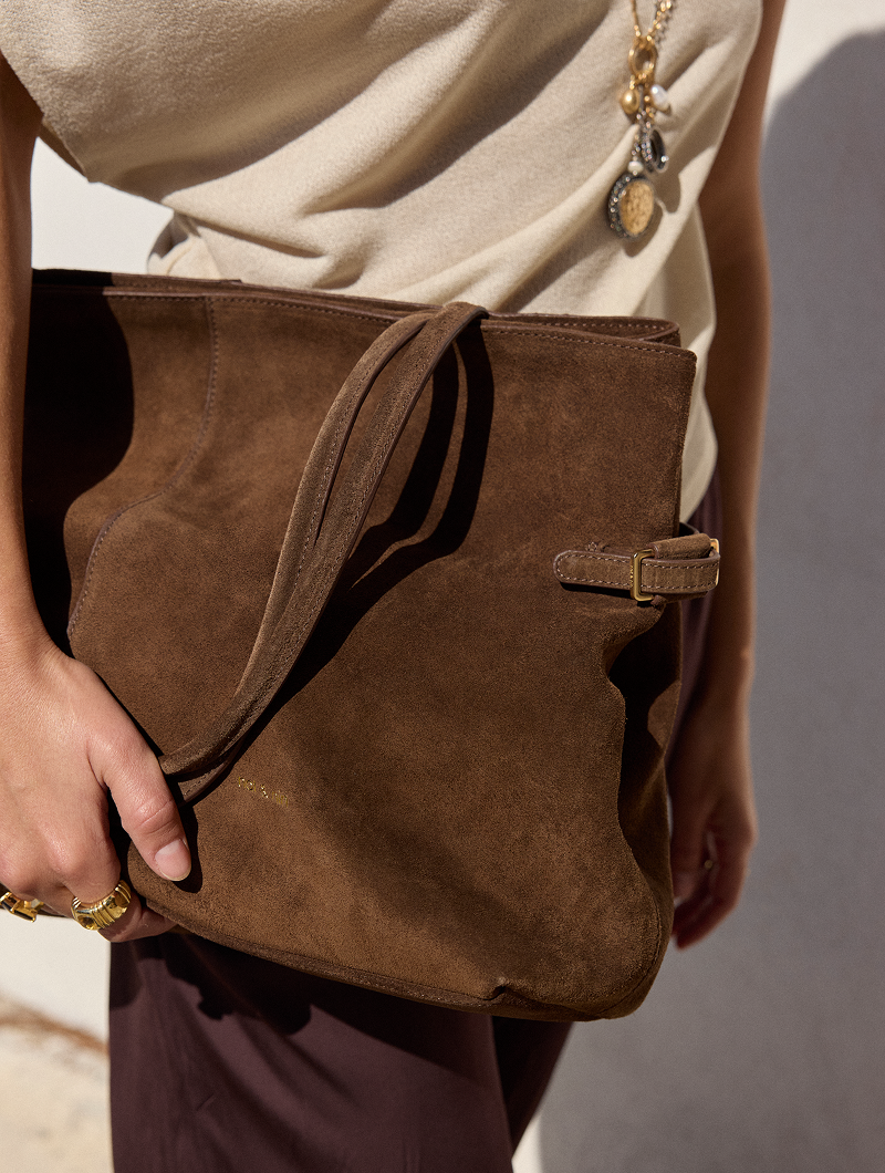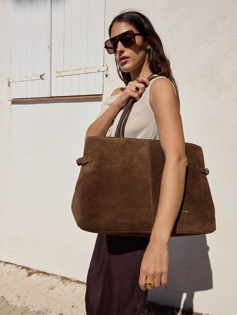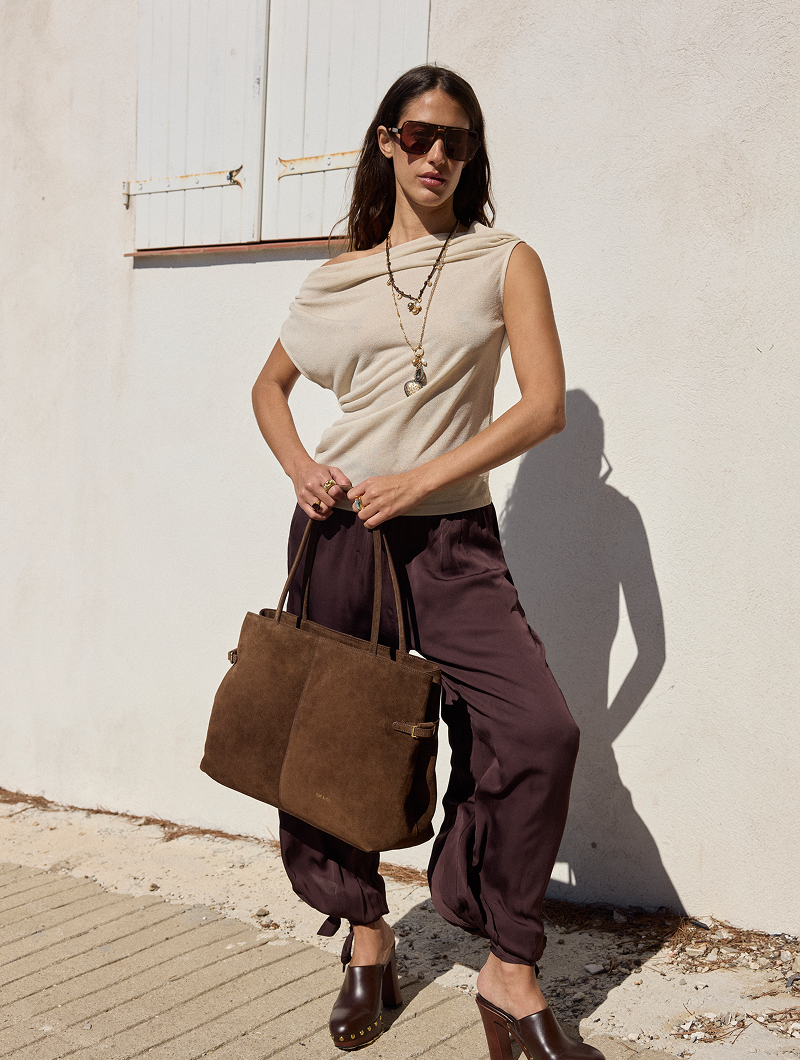 Le sac cabas Pablo séduit par son allure généreuse et sa douceur en cuir suédé. Son porté épaule confortable et sa fermeture pression en font un allié du quotidien, tandis que son intérieur organisé — poche zippée, deux poches plaquées et porte-cartes — permet de garder l’essentiel bien rangé.