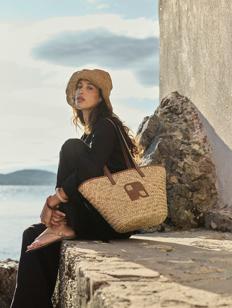 Confectionné en fibre de paille et cuir de vachette véritable, Papaya allie design fonctionnel et allure estivale.